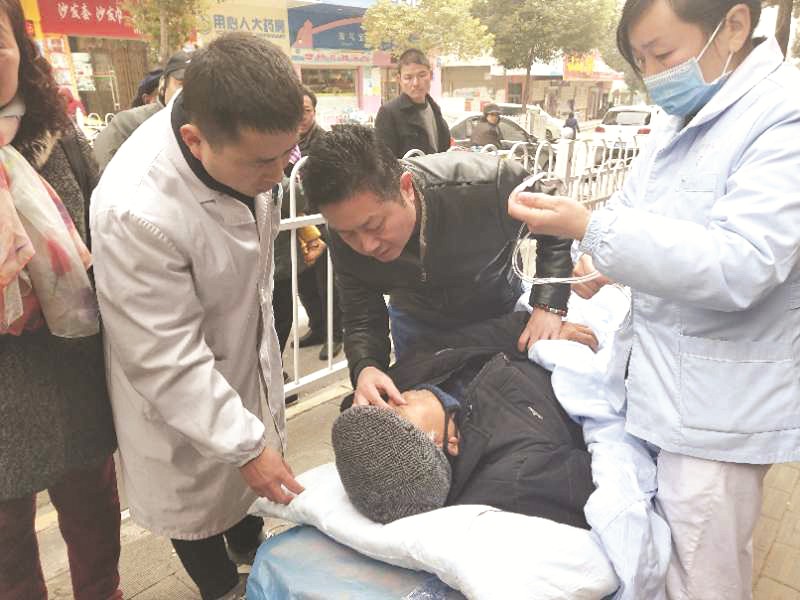 本报讯 记者纪枫波 实习生周慧报道:1月18日上午10时许,郧阳区城关镇中岭街十字路口处发生温暖一幕:一名老人途经这里时突然倒地不起,过路市民及时拨打120急救电话,并接力施救,老人得到及时救治(如图)。