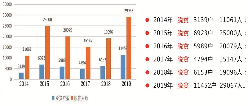 2014年以来,以贫困家庭子女、毕业年度的高校毕业生、城乡未继续升学的应届初高中毕业生、农村转移就业劳动者、城镇登记失业人员为重点,组织贫困劳动力就业创业培训7010人,农村贫困劳动力转移就业18914人次,开发扶贫公益性岗位安置就业7359个,与广东地区、北京市密云区建立劳务协作关系,转移贫困劳动力就业1021人次;扶持贫困人员创业226人。