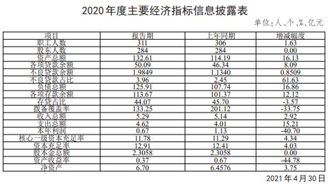 2020年末各项拨备余额达到3.65亿元,其中:贷款损失准备2.64亿元,拨备覆盖率133.25%,拨贷比5.28%。