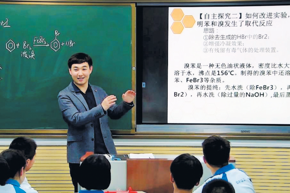 姚成杰 让教与学发生化学反应 化学是一门怎样的学科?在东风高中化学教师姚成杰看来,这是一门结合了文科记忆和理科思维的综合性学科,要想让学生对此形成浓厚的学习兴趣,掌握好的学习方法,关键在于让“教”与“学”发生深刻的“化学反应”。 “潜水艇在水下的时候,船员呼吸会产生很多二氧化碳,那么这些二氧化碳是如何排出的呢?”在引出《氧化钠与过氧化钠》一课时,姚成杰通过一个生动的案例激起学生的好奇心,接着,他邀请一名学生用一团棉花包裹适量过氧化钠粉末,置于石棉网上,用一只长导管对过氧化钠缓慢吹气,渐渐地,棉花燃烧了起来。“看来这位同学今天火气有点大。”此话一出,学生们哄堂大笑,姚成杰趁热打铁,指导学生进行化学实验分析…… 如此丰富的内容、如此有趣的设计,学生仿佛走进了一幅丰富多彩的画卷,但姚成杰并不满足于此,他认为,学科素养必须经过学生深入的思维活动,让知识与活动产生“化学反应”才能形成。基于此,他开始引导学生通过观察、阅读、思考、分析、讨论、探究等途径开展自主学习,学会运用学习化学的基本方法——“提出问题-分析推测-实验验证-得出结论”,促进学生深度理解、建构观念、熏陶精神,发展宏观辨识与微观探析、证据推理与模型认知等能力,取得了很好的教学实效。 “姚老师不会把问题的答案直接告诉我们,而是更加强调问题解决的逻辑与过程。他的课让我学会了学习不只是求答案,而是学逻辑、学思维、学思想”。姚成杰班上的学生夏书仪说。