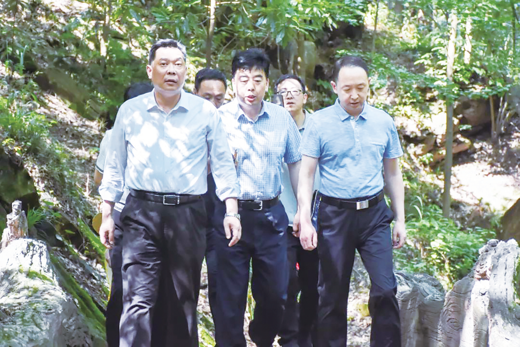 市中级人民法院院长王宏(左一)在湖北牛头山国家森林公园开展巡林、巡山工作。
