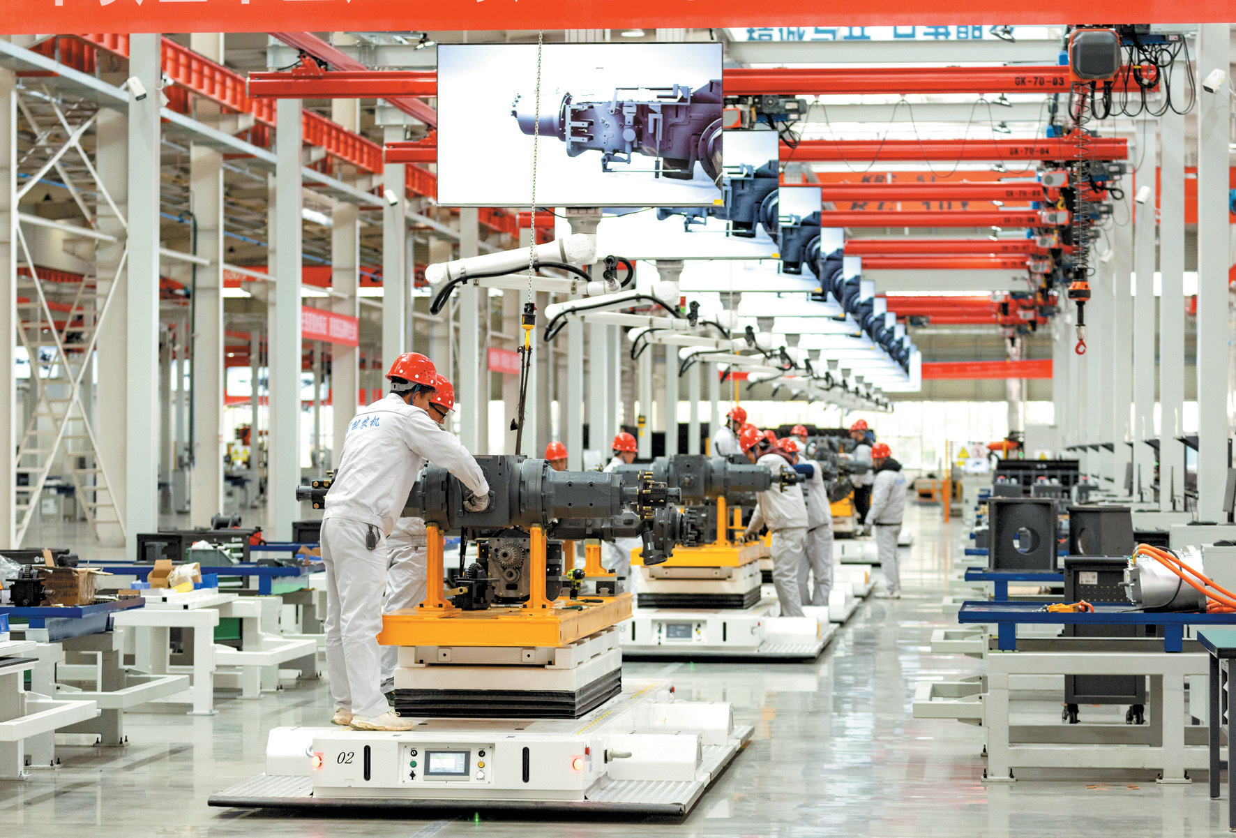 工人在十堰国科鸿鹄科技有限公司智能农机柔性生产线旁,生产智能农机设备。记者刘昆摄